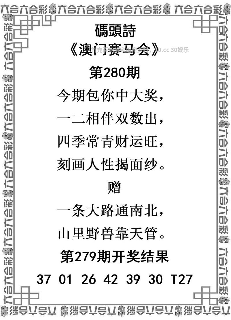280期⑩码 | 06.42.11.35.36.48.21.45.01.37 | 开:鼠42 |
